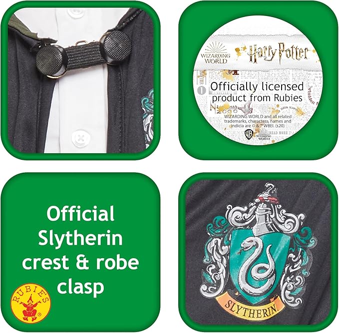 Includes Slytherin House Robe With Logo detail on chest, Green Trim & Front Clasp.