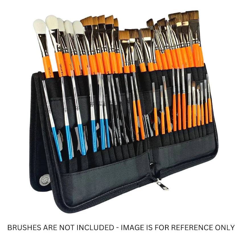 The wallet can hold 48 brushes, one per loop. Each brush is held on by a long elastic loop that is open at the top to make it easy to insert your brush and closed at the bottom so they don't fall out. This easy in easy out system will keep the brushes in place so long you keep your wallet vertical while opened.