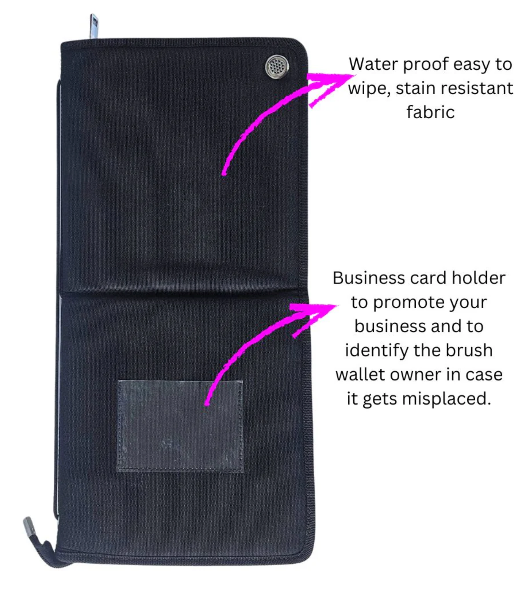 The area of the wallet that is in contact with the tip of the brushes on the top row (when the wallet is closed) is protected by a clear pocket that is super easy to clean so that your brush wallet looks always clean. The area of the wallet that is contact with the tip of your brushes on the bottom row is made from polyester making it super easy to clean as well.