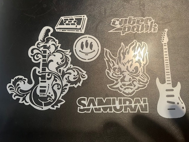 Sizes range (approx) 120mm x 110mm for the Decorative Guitar to 40mm Dia. for the Happy Face.