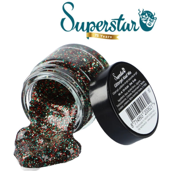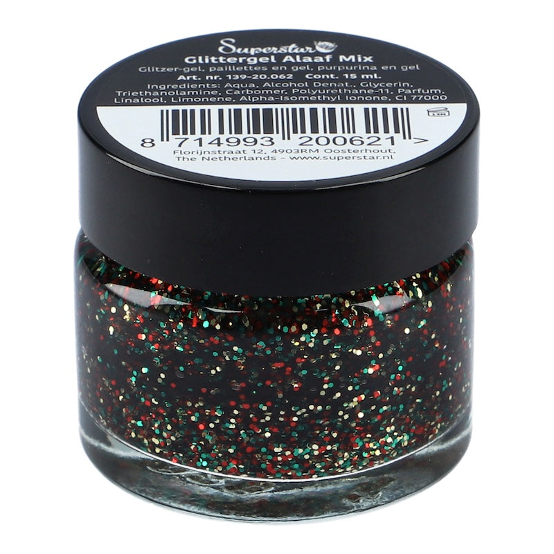 The Superstar Glitter Gel contains cosmetic grade Polyethylene Terepthalate glitter (3 hex) in a gel base. The gel has been developed in such a way that you can also apply it to the Superstar Aqua Face- and Bodypaint without dissolving it. In addition, the gel dries quickly. For a super glittering effect, you can apply an extra layer of loose glitter while the gel is still wet.